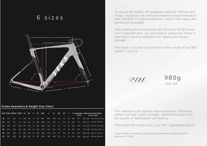 ‑ Frame material: TORAYCA T1100G & M46J carbon fibre, monocoque one‑piece moulded structure.